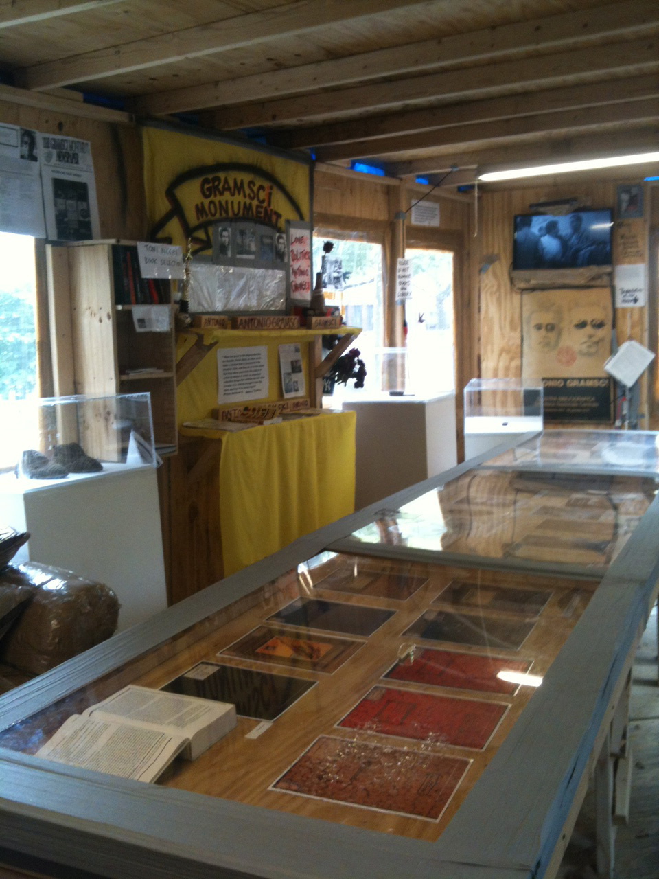 Reading about Gramsci, looking at pictures of him, artefacts from a museum in Italy, of his slippers and comb from prison, in a balsa wood rickety shack, listening to R&B or whatever booming in the background, in the South Bronx. Now that’s an NYC experience I won’t forget.