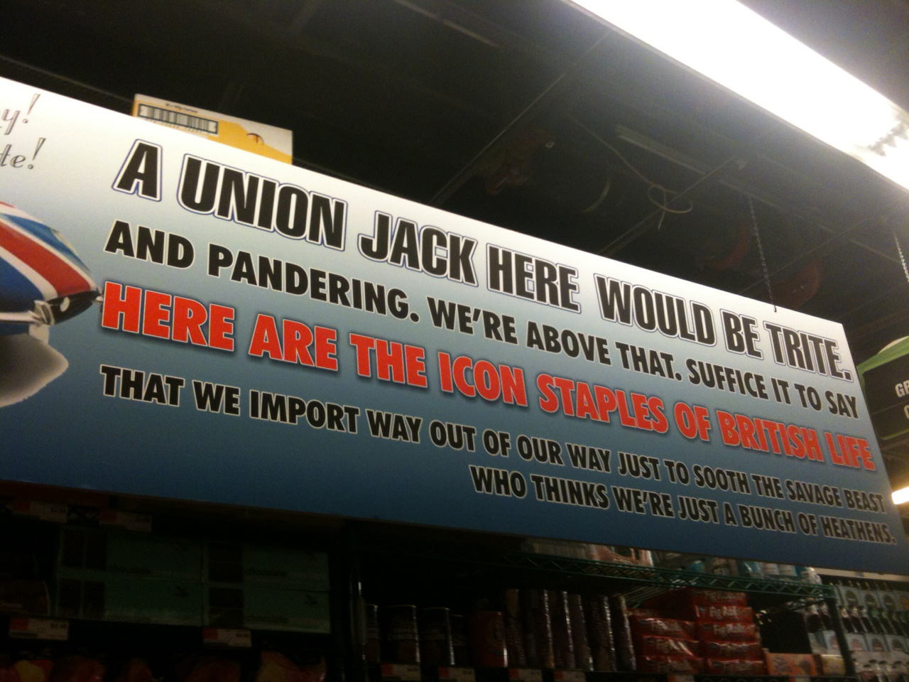 “A Union Jack here would be trite. And Pandering. We’re above that. Suffice to say here are the icon staples of British life that we import way out of our way to sooth the savage beast who thinks we’re just a bunch of heathens.”