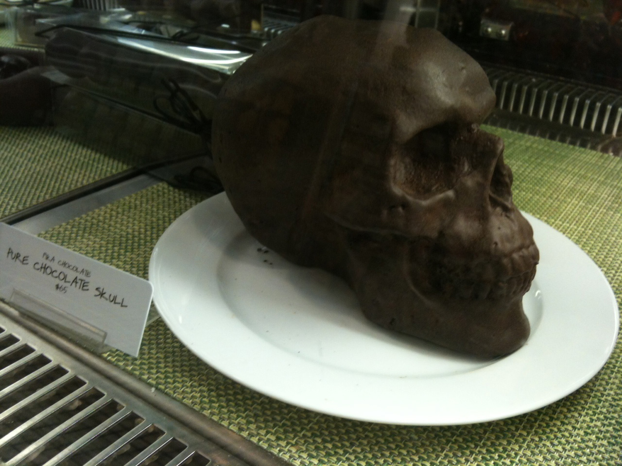 I was reminded of this when I went into Dean and Deluca earlier today. As New York gears up for Halloween (it’s everywhere and it’s nearly a month away) they have put on sale a solid chocolate skull. I took a snap to share my incredulity with you today. It’s price?  A mere $65. Gumph. How would you eat it?